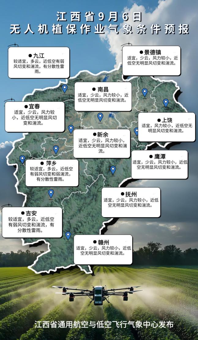 现在农业喷药施肥等工作常用无人机操作,明天的天气条件适不适宜无人机农业植保作业呢?江西省通用航空与低空飞行气象中心推出了全省各市无人机植保作业气象条件预报。