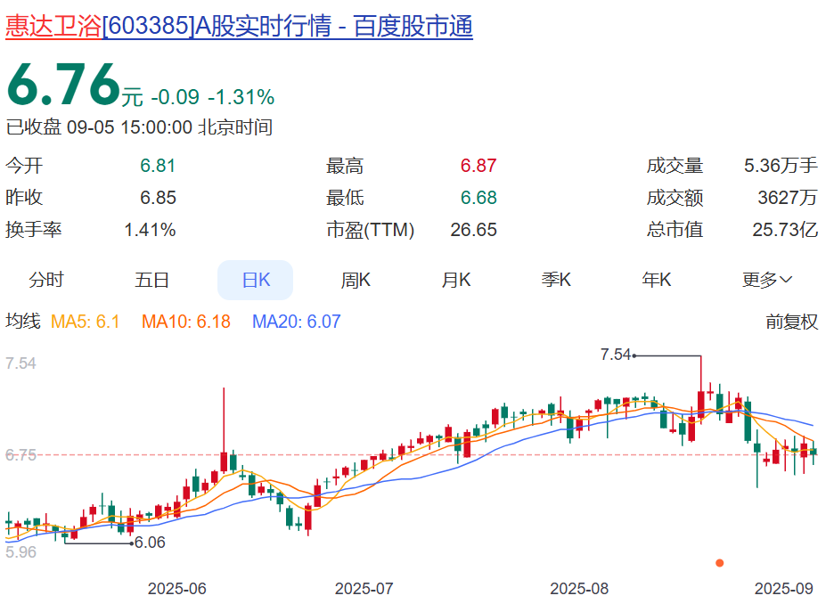 近期,惠达卫浴股价持续震荡。9月5日,公司股价逆势下跌1.31%,报收6.76元。