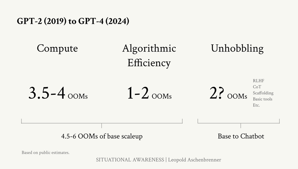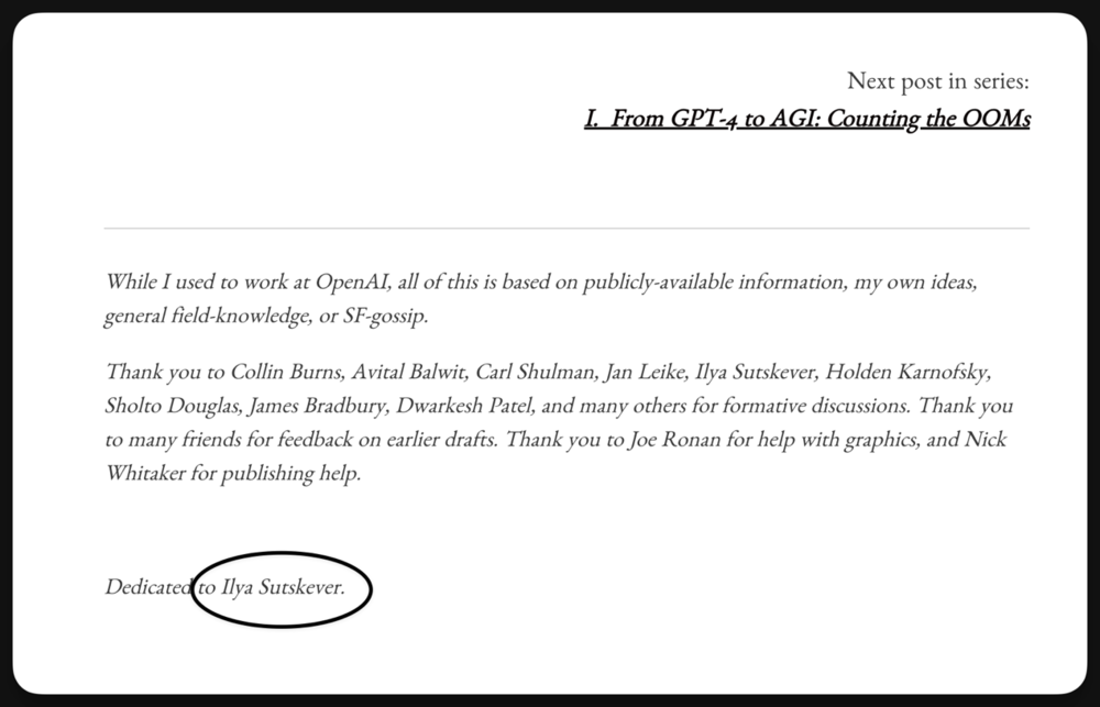 不过,被解雇没打倒Aschenbrenner,反而让他沉淀了两个月。2024年6月,他发布了165页的《态势感知:未来十年》,文章在科技圈和投资界疯传,他还特别致谢了AI圈子里的大神Ilya Sutskever(OpenAI联合创始人)。