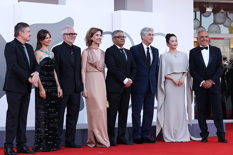评委会主席亚历山大·佩恩(右三)与赵涛(右二)、费尔南达·托雷斯(左四)等评委与威尼斯电影节总监阿尔贝托•巴贝拉(右一)现身闭幕典礼红毯。