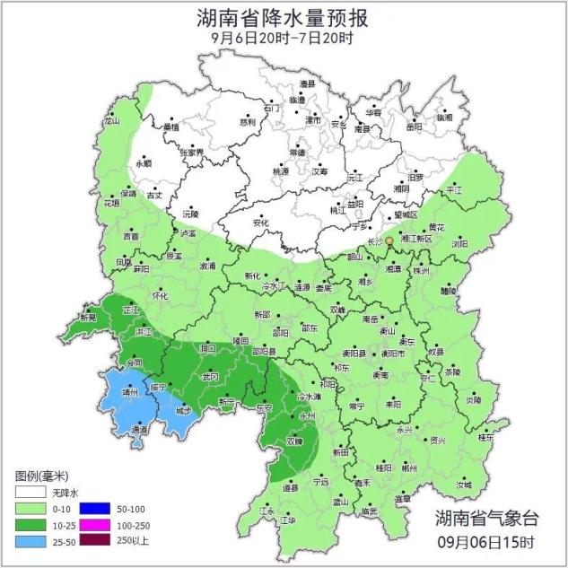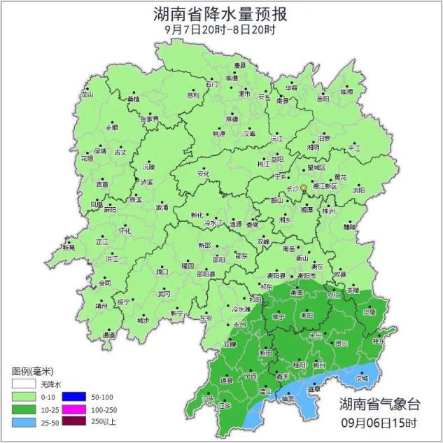 9月6日晚至7日白天,湘中以南多阵雨或雷阵雨天气;7日晚至9日白天,省内多阵性降雨,湘南、湘北局地有大到暴雨。