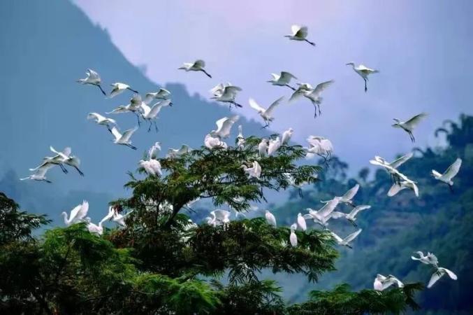 孟连傣族拉祜族佤族自治县的南垒河沿岸,茂密的树林为白鹭提供了绝佳的栖息环境,常常能看到它们成群飞舞的优美姿态。