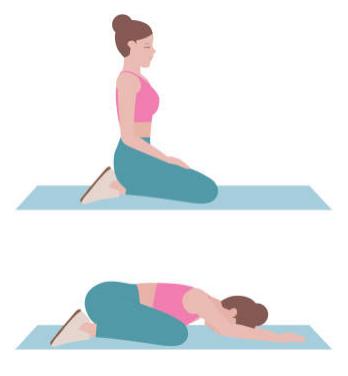 做法:跪坐于地上,双膝张开,然后坐在脚后跟上。让心脏贴着床垫,额头向下贴于地面,双臂向前伸展贴于地面或置于身体两侧。可以在腹部下方或额头下方放一个靠垫,增加支撑。