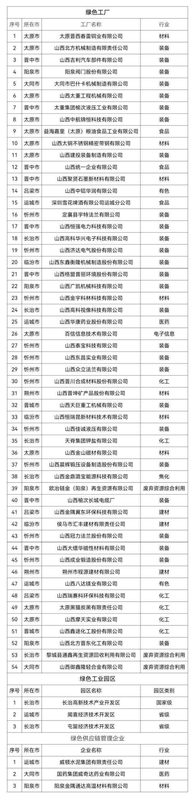 9月5日,山西省工信厅公布了2025年度山西省绿色制造名单。其中,有54家企业入选绿色工厂,3个园区入选绿色工业园区,3家企业入选绿色供应链管理企业。