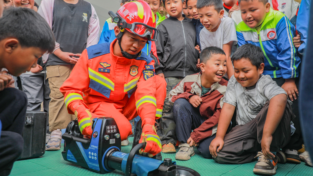 捐赠仪式结束后,消防员结合自身经历,为学生们讲述励志故事,鼓励他们不惧困境、奋发向上。在给予经济帮助的同时,还将“消防安全课堂”融入到了助学行动中。指战员用简单易懂的讲解和生动有趣的互动,让学生们在欢乐中学习应急知识。看到从未见过的灭火机具,学生们纷纷与消防员互动,并要求体验机具。在消防员的指导和保护下,大家有序地体验背负灭火装备、学习灭火技能。