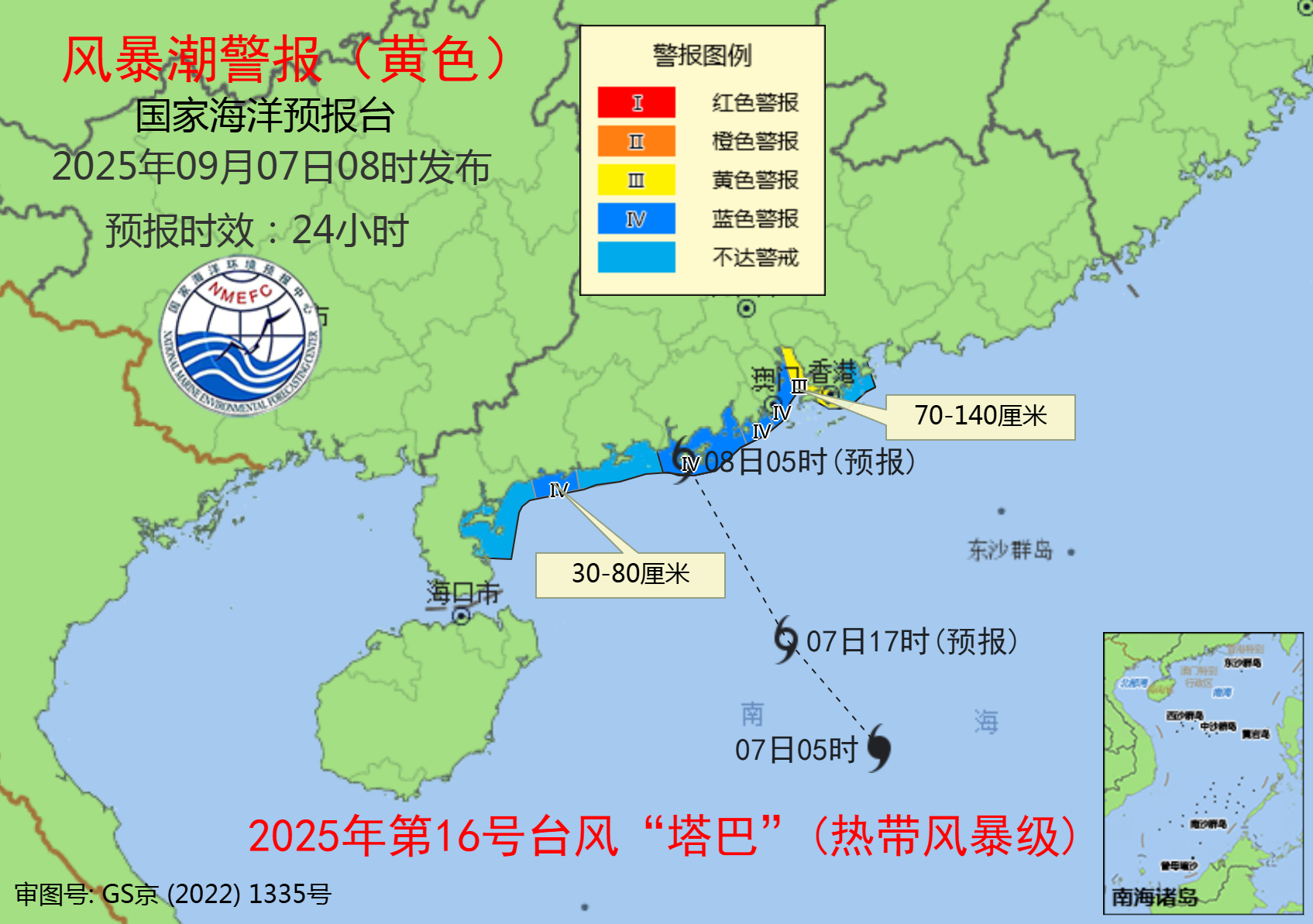 9月7日,澎湃新闻从自然资源部了解到,南海热带低压于昨日(6日)夜间增强为今年第16号台风“塔巴”,目前正逐步向粤西沿海靠近。受其影响,预计广东西部近岸海域会出现大浪到巨浪,广东深圳到湛江沿海将经历风暴潮过程。国家海洋预报台于今日(7日)上午发布了海浪橙色警报和风暴潮黄色警报。