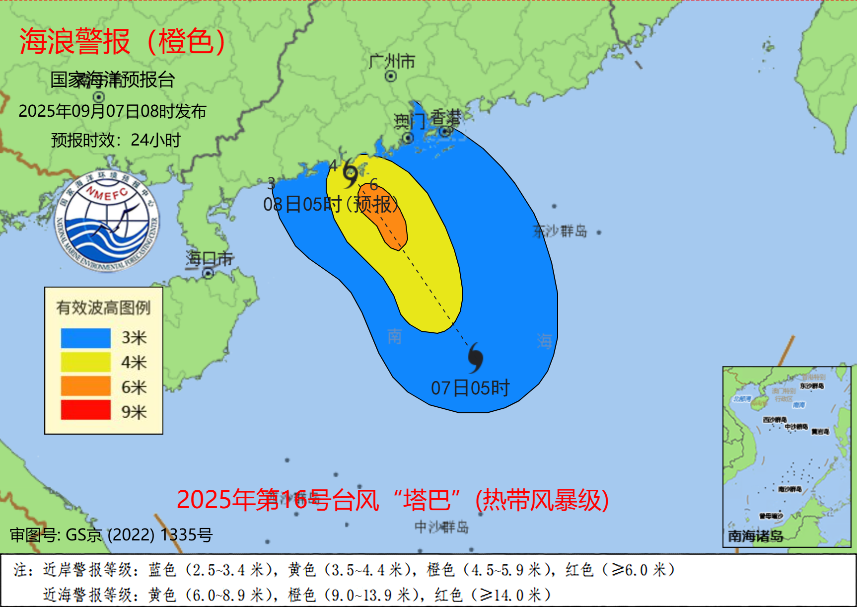 海浪方面,预计9月7日上午至8日上午,南海西北部将出现4到7米的巨浪到狂浪区,近海海域海浪预警级别为黄色;广东西部近岸海域将出现3到4.5米的大浪到巨浪,该近岸海域海浪预警级别为橙色,广东东部近岸海域将出现2到3米的中浪到大浪,该近岸海域海浪预警级别为蓝色。在此海域作业的船只需注意安全,沿海各相关单位要提前做好防浪避浪措施。