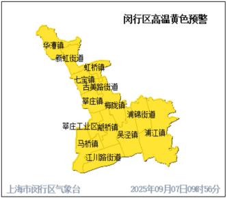 闵行预警发布中心于2025年9月7日09时56分发布了高温黄色预警信号。