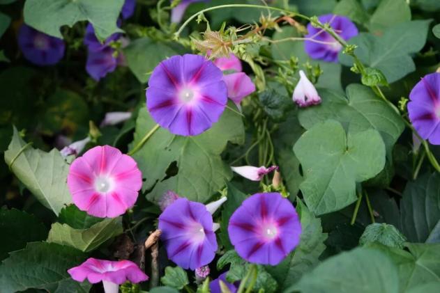 先来说说牵牛,也就是喇叭花,它在夏秋季节开花。小时候,老院子的篱笆下种满了牵牛花,夏天时,蓝的、粉的、紫的、桃红的花朵爬满篱笆,像在吹着小喇叭。