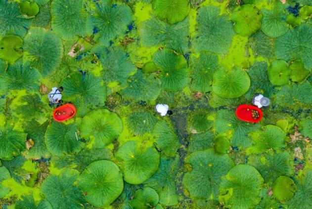 采摘芡实时,水乡人会以芡实植株为中心,用竹刀在叶子上划一个圆,然后将拳头大小的芡实果实拉出水面,在根上划两刀割下来,放入竹篮。