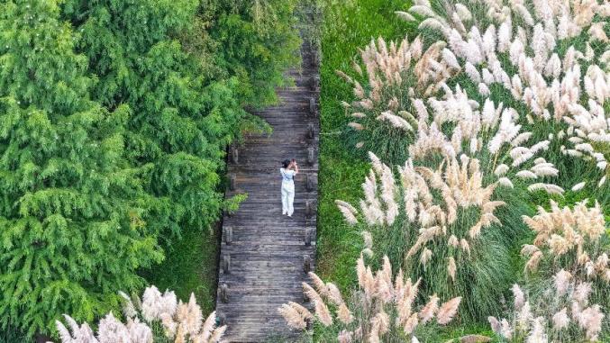 沿着木栈道缓缓前行,连绵的芦苇随风翻涌,仿佛把夏天最后的热情,都揉进了这片柔软的“雪浪”里。