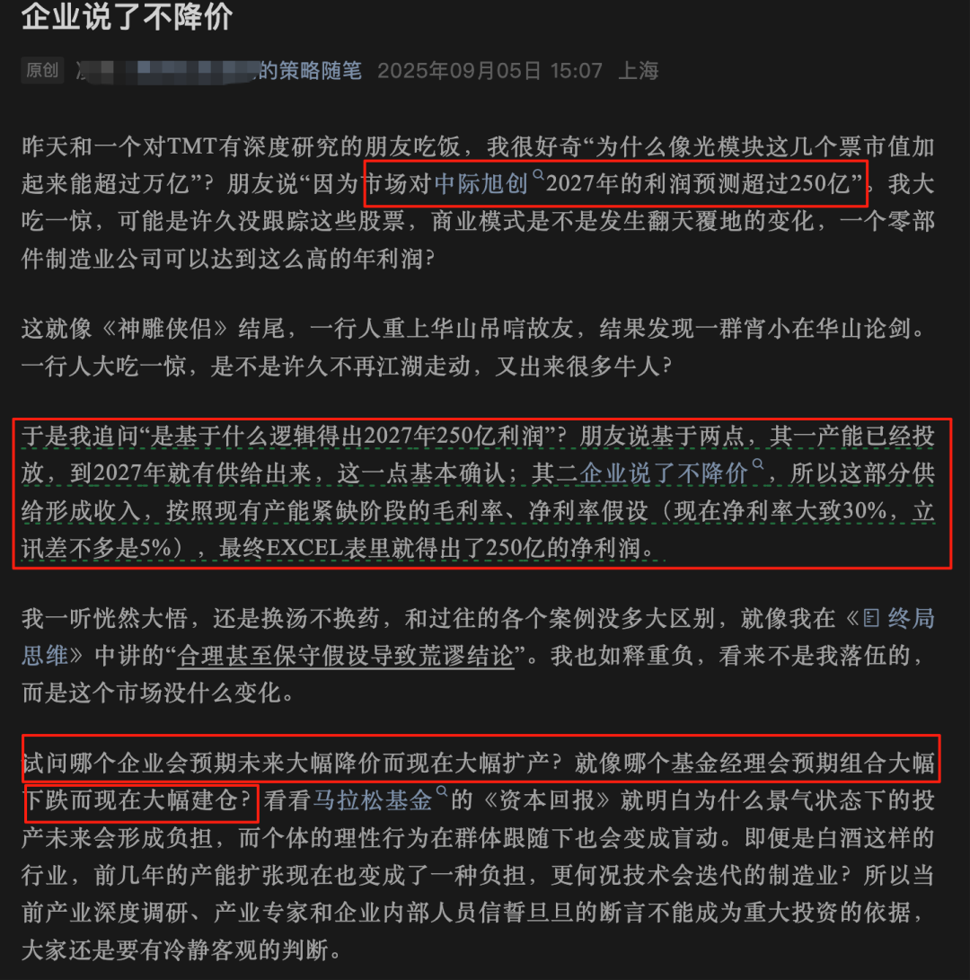 凌鹏发文解释了市场得出中际旭创2027年250亿利润的两个逻辑:一是产能已经投放,到2027年有供给出来;二是企业表示不降价,这部分供给形成收入,按照现有产能紧缺阶段的毛利率、净利率假设,最终得出250亿的净利润。但凌鹏认为这种计算方式是“合理甚至保守假设导致荒谬结论”,他还反问,哪个企业会预期未来大幅降价而现在大幅扩产,就像哪个基金经理会预期组合大幅下跌而现在大幅建仓。