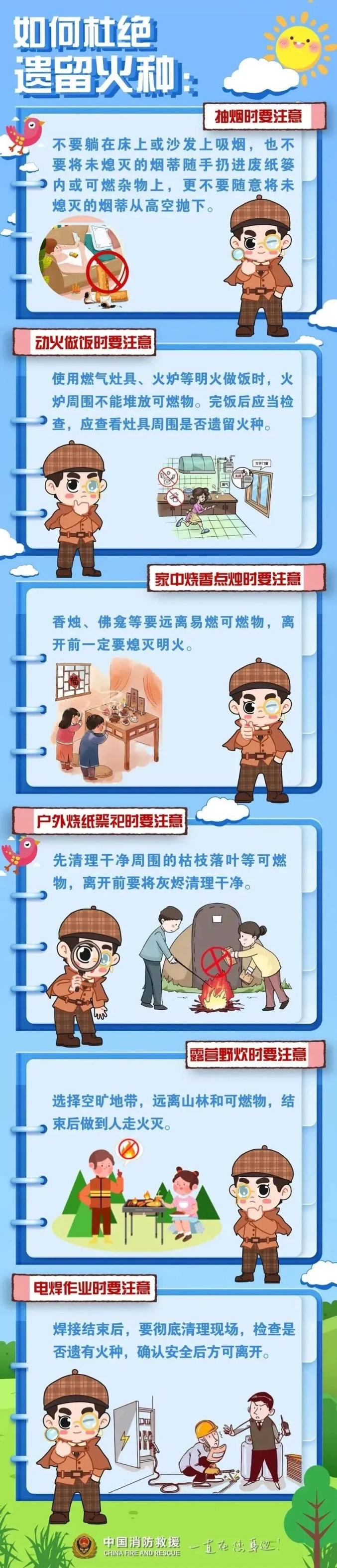 贵贵提醒,遗留火种威力大,防火切莫大意。大家在日常生活中一定要加强防范,做到人走火灭,防止“死灰复燃”。下面这些提示请谨记。
