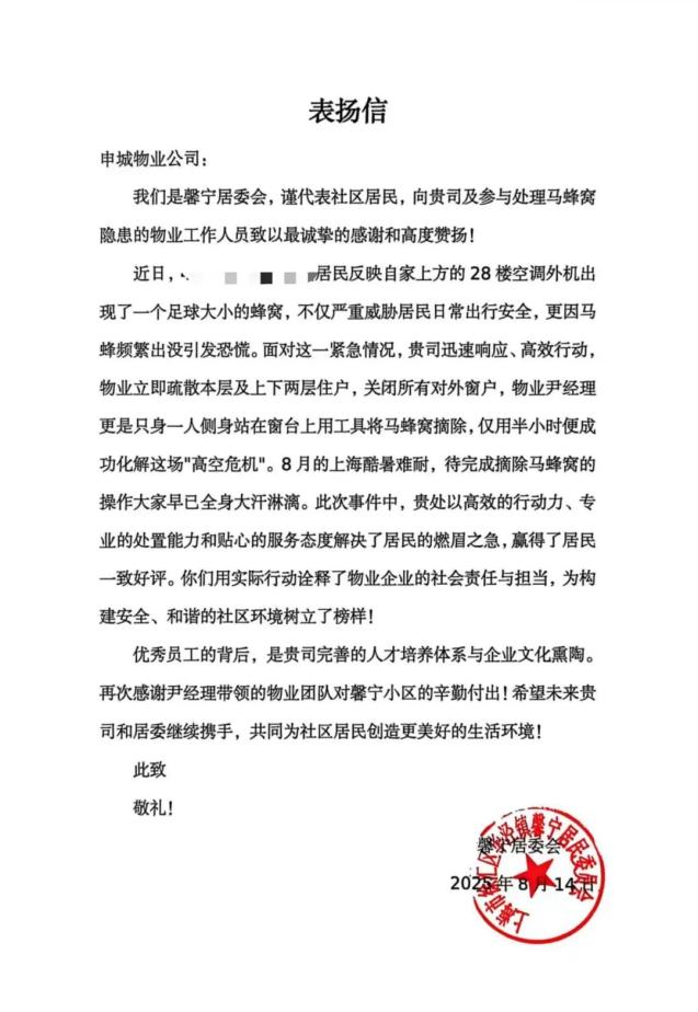 事后,张先生和其他业主对尹经理的勇敢表现给予了高度评价,也对物业高效的响应和处理能力表示赞赏。馨宁公寓居委会次日特发表扬信,代表社区业主向参与处置的物业工作人员致谢。