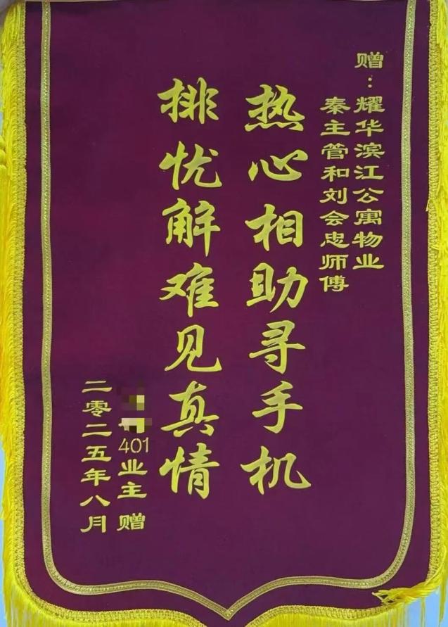 保洁主管询问晚班保洁员无果后,推测手机可能在清运途中因颠簸掉落。于是,他组织人员在小区路面进行了地毯式排查,最终在绿化带旁找到了遗失的手机。次日核实确认后,顺利归还给租户。租户对物业的高效响应和负责态度十分感激,特地送来锦旗表扬,称赞物业用实际行动践行了服务承诺,让租户倍感安心。