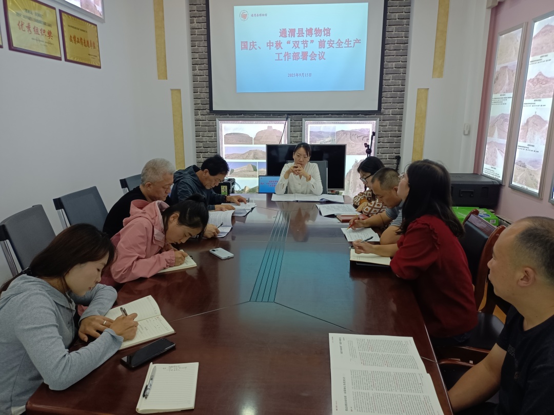 国庆、中秋“双节”临近,为筑牢博物馆安全防线,保障节日期间文物安全和参观秩序,9月15日上午,通渭县博物馆召开安全生产工作专题会议,全面部署“双节”前安全生产大检查工作,以高度责任感为假期安全护航。