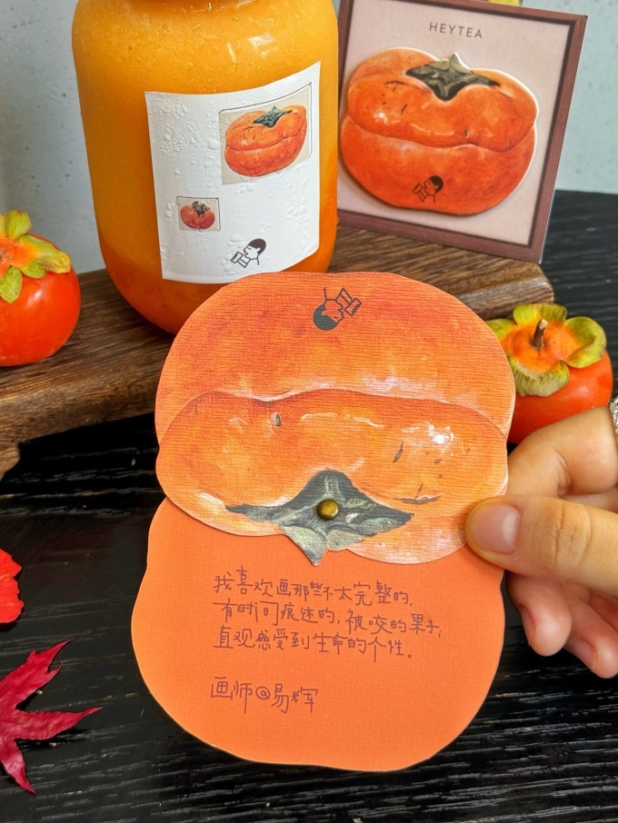 喜茶将易辉的柿子作品延展到喜柿多多的杯贴、灵感小卡以及画框形式的冰箱贴周边中。同时,在喜茶上海正大广场店推出“日日柿好日”线下小展,让消费者在品尝饮品的同时,也能感受果实中的艺术灵感。喜茶选取柿子系列中属于“成熟”的那一幅作为产品视觉主体,恰似喜柿多多杯中封存着柿子成熟那一刻的滋味。
