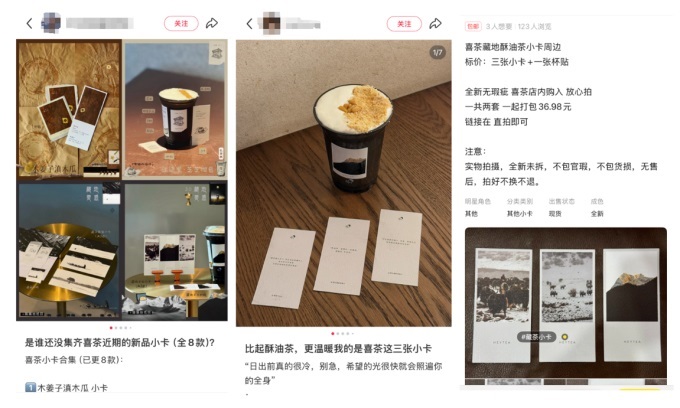 作为差异化战略的体现,喜茶在今年产品上新、回归等行动中,更加注重进行差异化的灵感表达,为消费者带来综合性的体验。围绕产品的地域特色、情绪氛围、自然灵感等,喜茶不断以包括杯贴、纸袋在内的定制包材,产品小卡、明信片为载体,进行充满设计感的演绎。不少消费者在品尝喜茶饮品之余,还专门开始收藏此类物料,甚至催生出相应的二手交易。在某二手平台,就有不少人加价售卖喜茶纸袋、产品灵感小卡、杯贴等原本免费随杯附送的品牌物料。
