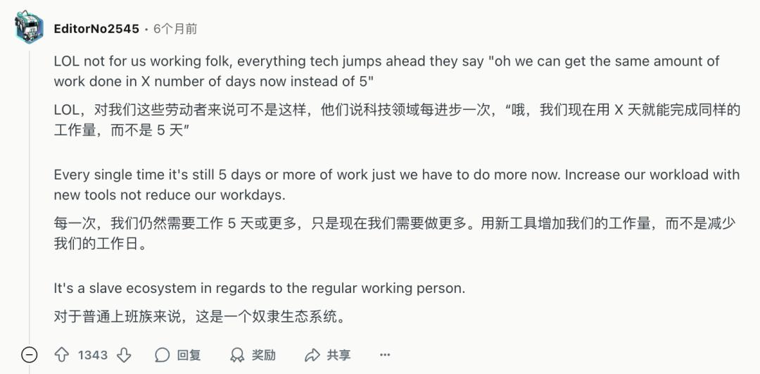 但实际并非如此。此前比尔·盖茨表示,由于AI正在取代人类「大多数工作」,只需10年就能实现每周工作2天,立刻遭网友怒怼,网友认为对于普通打工人,每次都是「用新工具增加我们的工作量,而不是减少我们的工作日」。
