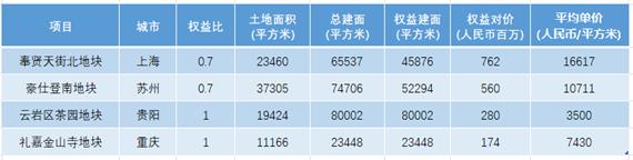 其中上半年在苏州、上海、重庆、贵阳共新增4宗土储,总建筑面积24.37万平方米,权益建筑面积20.17万平方米,权益地价总额为人民币17.76亿元。