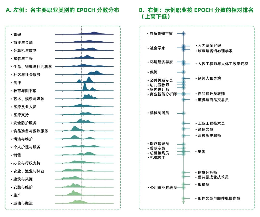 图:各主要职业类别的EPOCH分数分布与各细分职业按EPOCH分数的相对排名