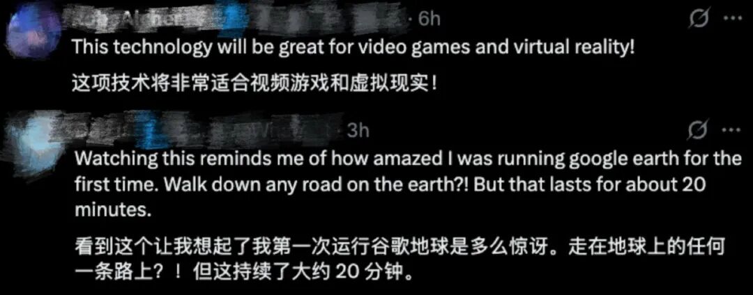 在World Labs官方X账号的评论区,不少网友开启了夸赞模式,有人称这项技术非常适合视频游戏和虚拟现实,还有人说这让他想起了第一次运行谷歌地球的场景。