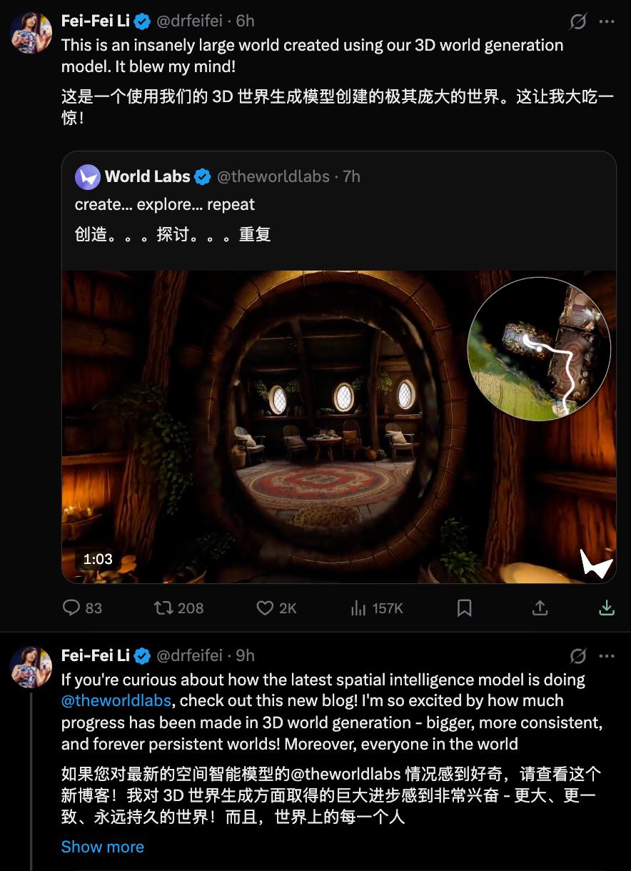 李飞飞连发两条帖子对新模型赞不绝口,她对3D世界生成的进展感到十分兴奋,并且对模型已经能够生成极其庞大的3D世界感到震惊。