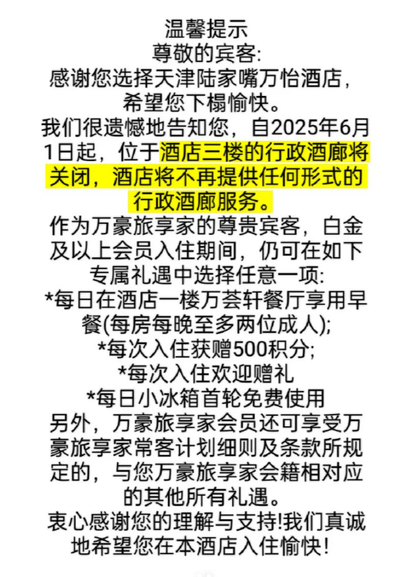 自2025年3月起,多家万怡酒店陆续永久关闭行政酒廊,且无替代方案。杭州钱江新城万怡直接官宣“永久关闭,不补位”,新昌、成都、天津的也跟风缩减。