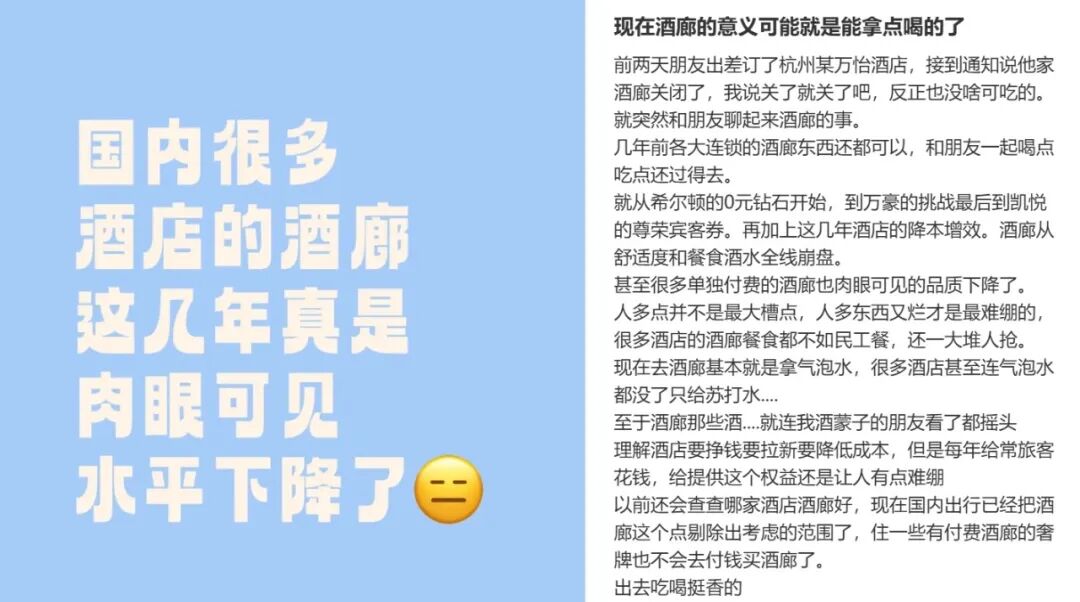 关键是,这些品牌砍掉行政酒廊后,从社媒用户反馈来看,大家没什么抱怨,反而有点如释重负。