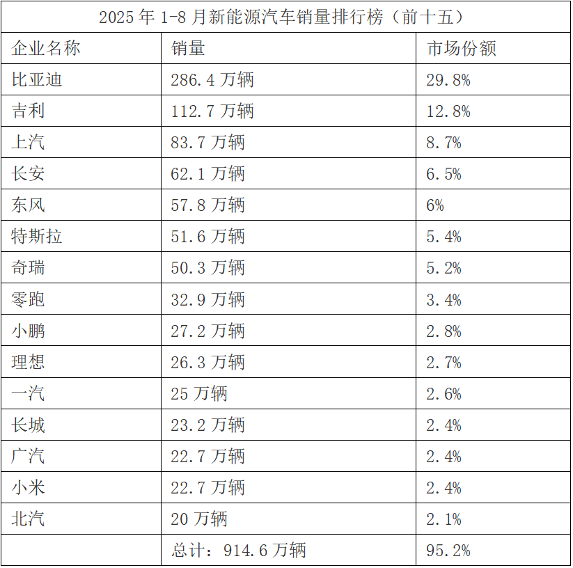 反做空一线也同时整理了2025年1月至8月汽车总体销量和新能源汽车销量排名前十五的企业,以供读者查阅。