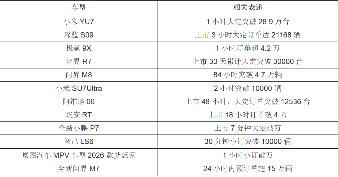 据业内人士统计,截至2025年8月底,国内上市的所有新车(含改款)已超过430款,可见汽车市场正进入“白热化”竞争阶段……近年来,车企对产品“一分钟/一小时订单量突破XX万台”的相关信息表述,引发了许多网友的讨论和关注。有网友统计,各大车企今年公布的订单总量居然已经突破了5000万辆!