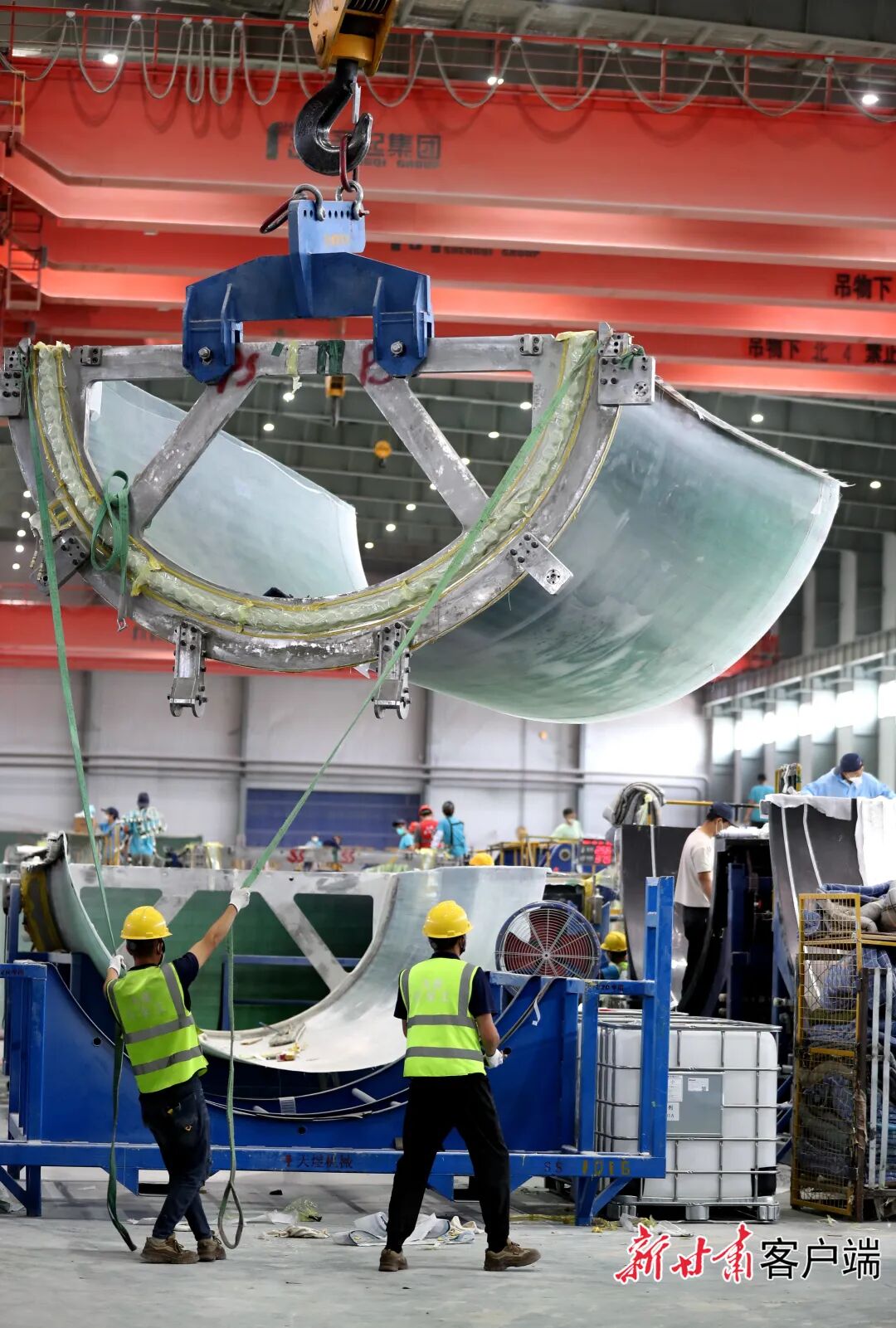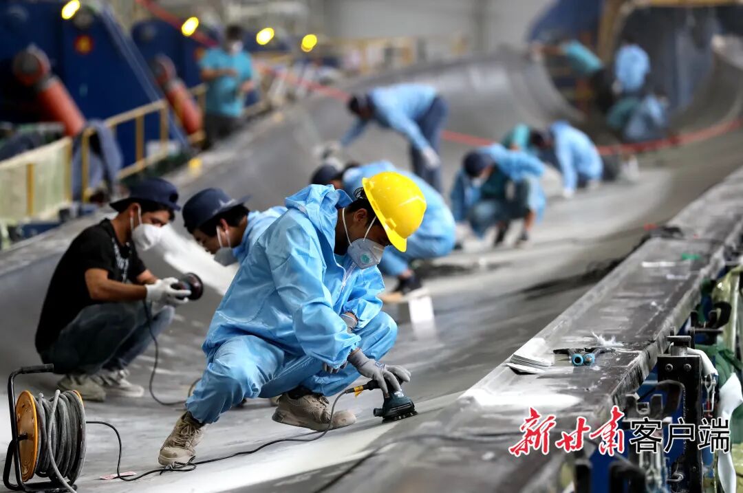 走进酒泉经开区,大型设备运行的轰鸣声不绝于耳,就像戈壁新城有力的心跳。在甘肃九鼎风电复合材料有限公司的生产线上,长达百余米的大兆瓦级风电叶片正缓缓成型,展现出了现代工业的宏大尺度。这个总投资9亿元的项目,不仅具备年产500套巨型叶片的能力,还能年产1000套机舱罩、轮毂罩。全部达产后,年产值将突破23亿元。