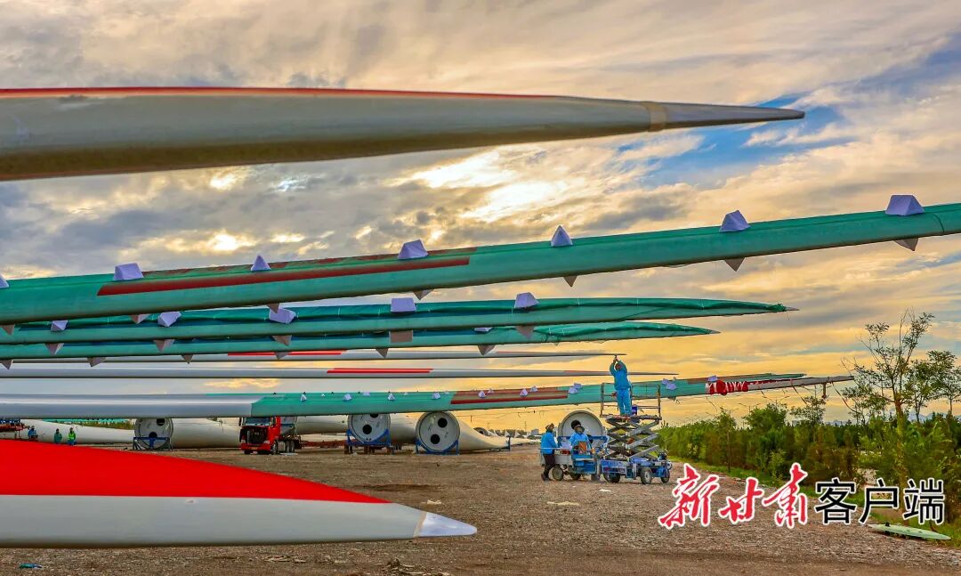在酒泉经开区的堆场,巨大的风机叶片整装待发,仿佛在等待着开启新的征程。