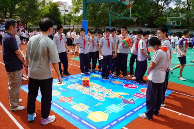 “棋盘闯关”区将广场地面变成巨型棋盘,同学们要回答“对方偷看你的手机”等情景事件对应的法律条款或应对措施,每答对一题向前跳跃时,都会赢得阵阵掌声和喝彩。