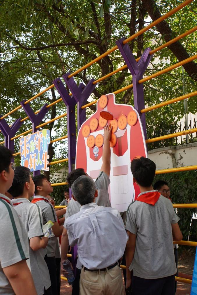 “扣好人生”区里,同学们站在指定位置,拿着磁吸道具扣子,奋力跳起将扣子吸在衣服形状的道具上,寓意为“人生的衣服”扣好法治的扣子。