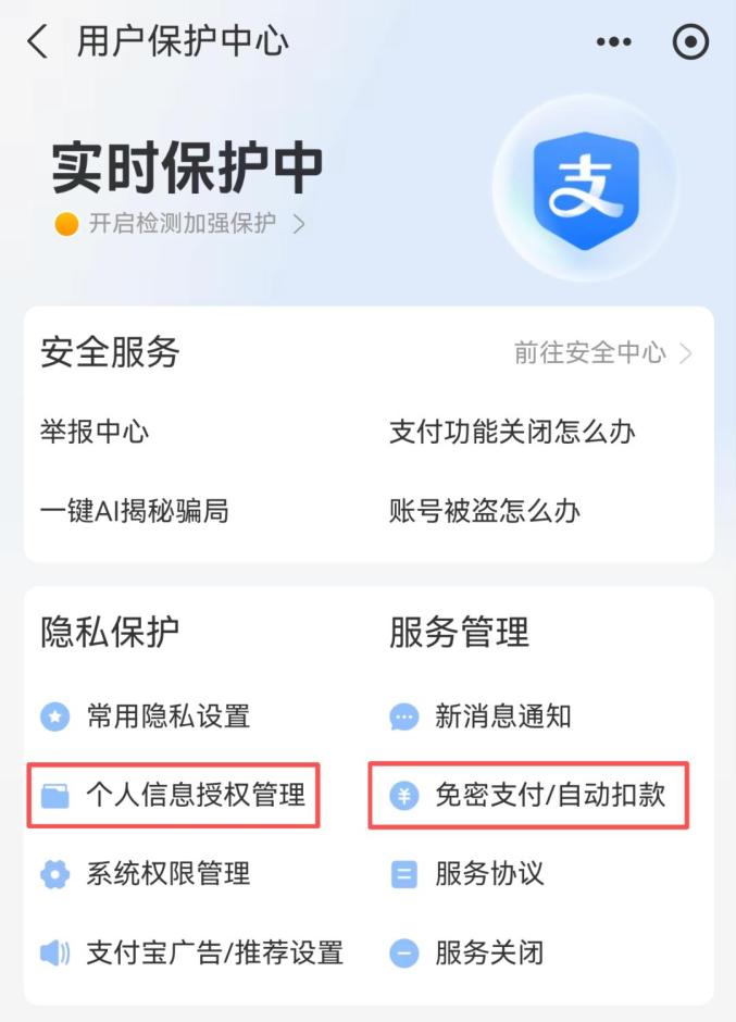 对此,消费者可定期检查和管理“账号授权”和“免密支付/自动扣款”。查看具体步骤为:「打开支付宝」—「我的」—「设置」—「用户保护中心」—「个人信息授权管理」/「免密支付/自动扣款」,及时解除不必要的“授权”,关闭不需要的“扣费”。
