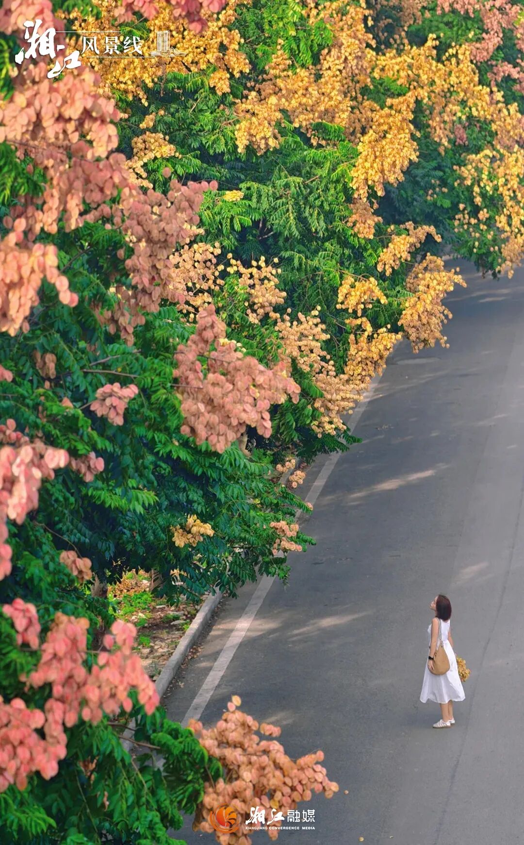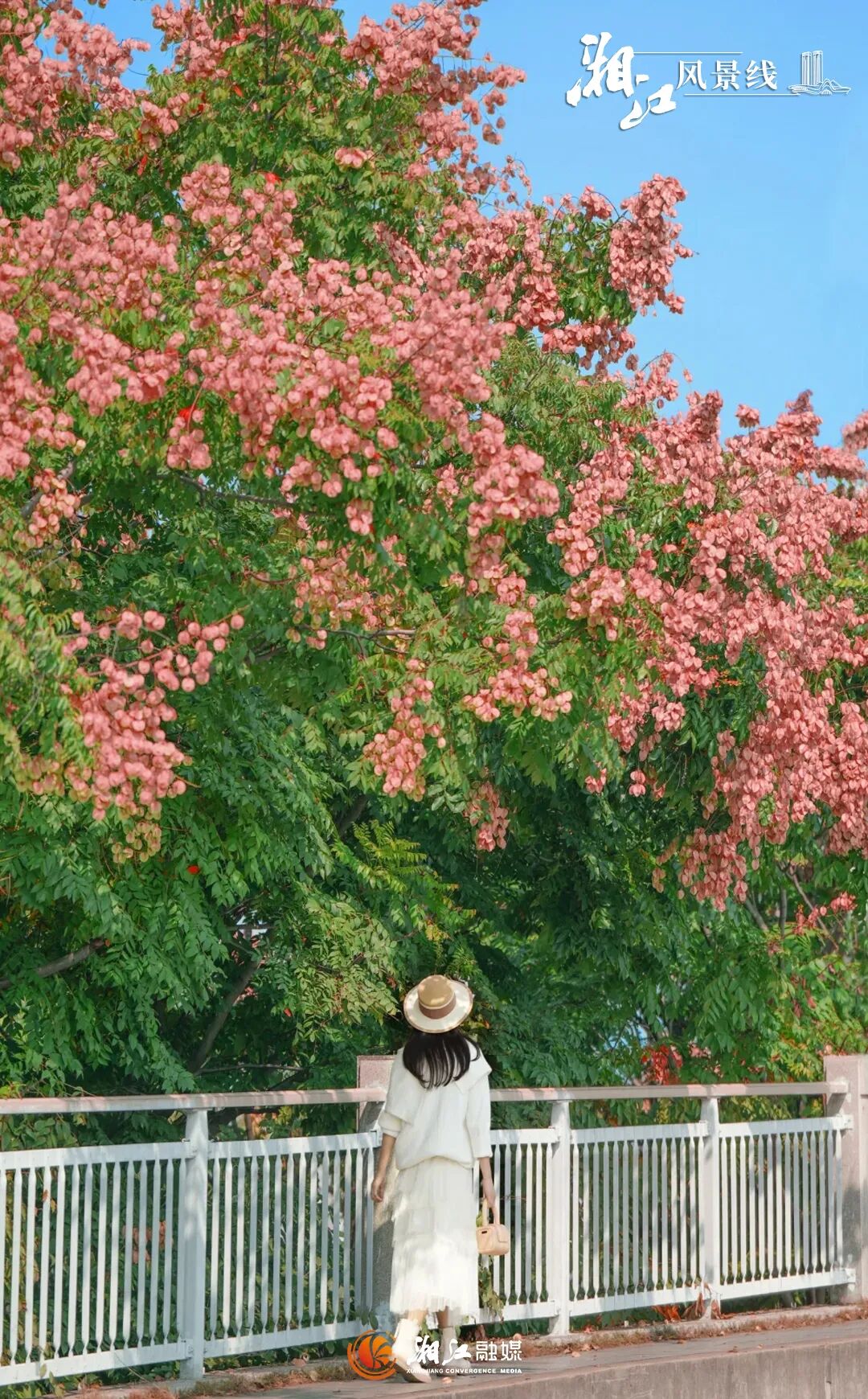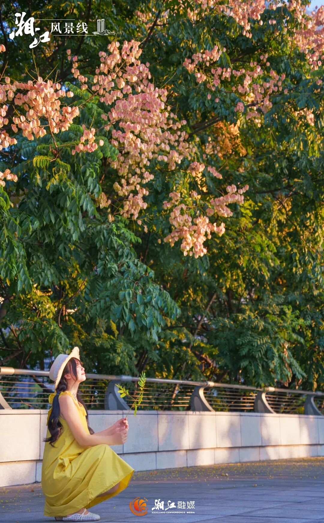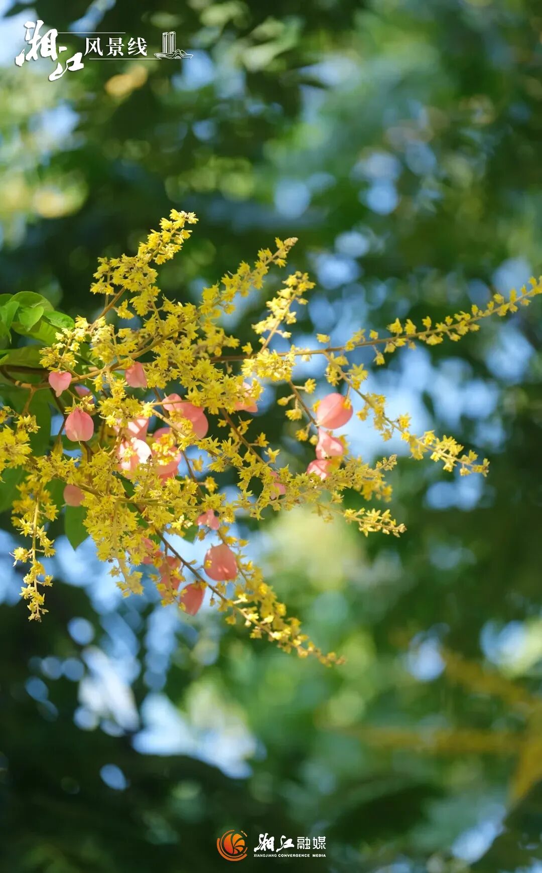 最近在长沙逛街,真的会被它“包围”!金黄的小花中点缀着粉红“灯笼”,风一吹就像下“黄金雨”,落在人行道上、车顶上,成了长沙初秋的 “氛围担当”。