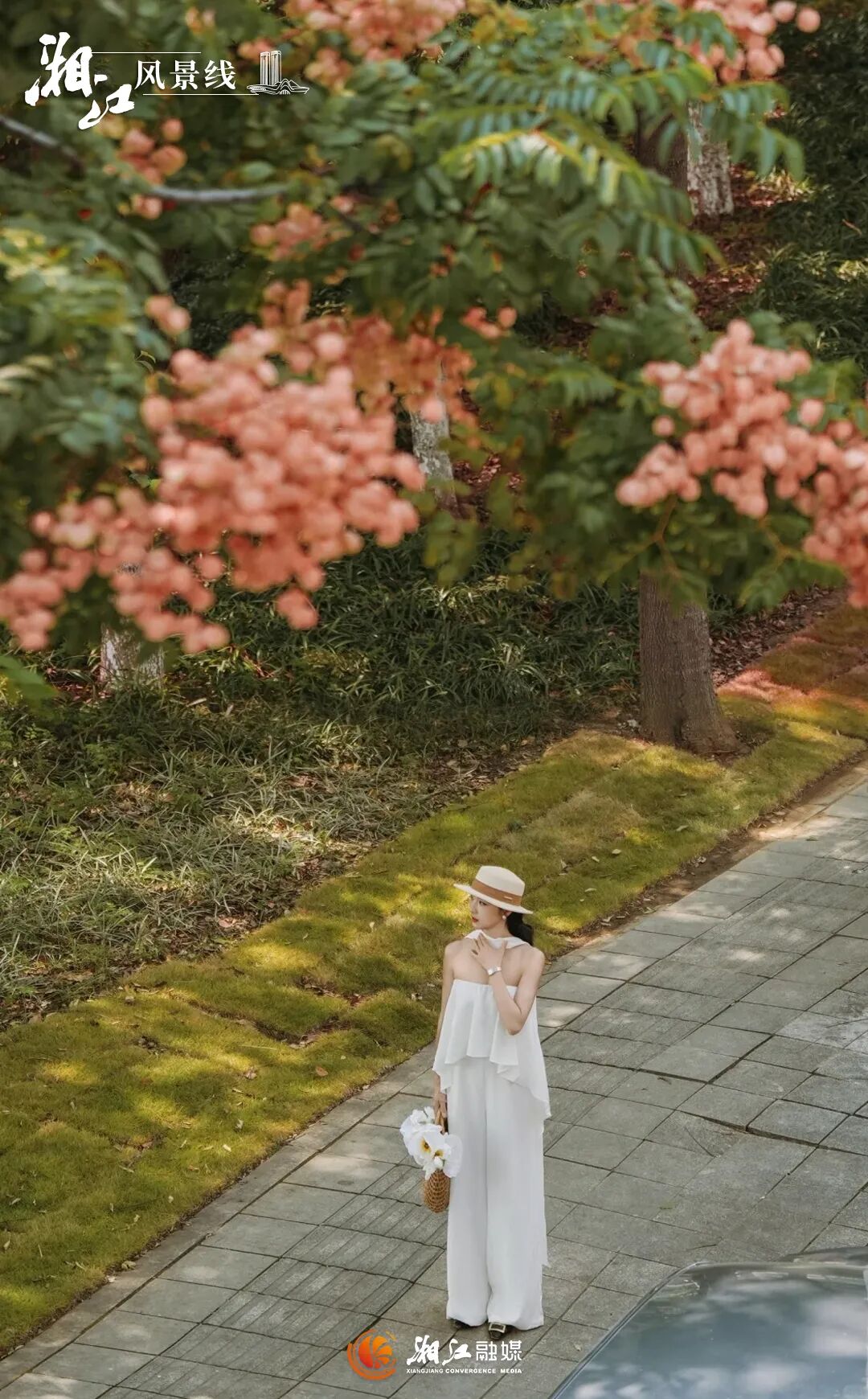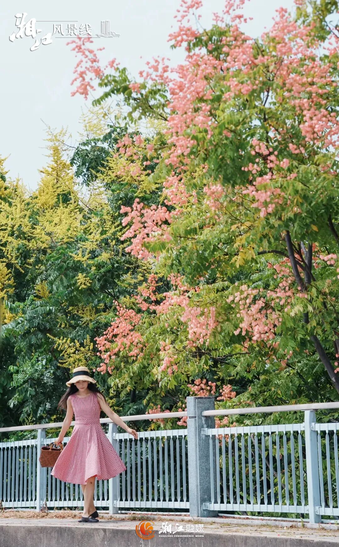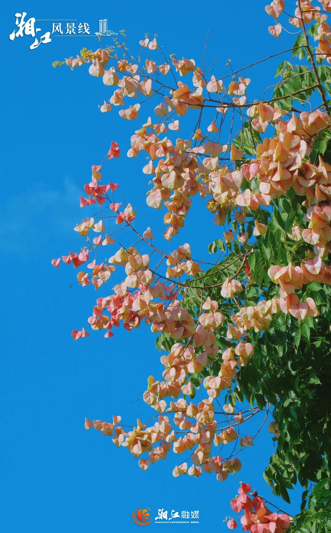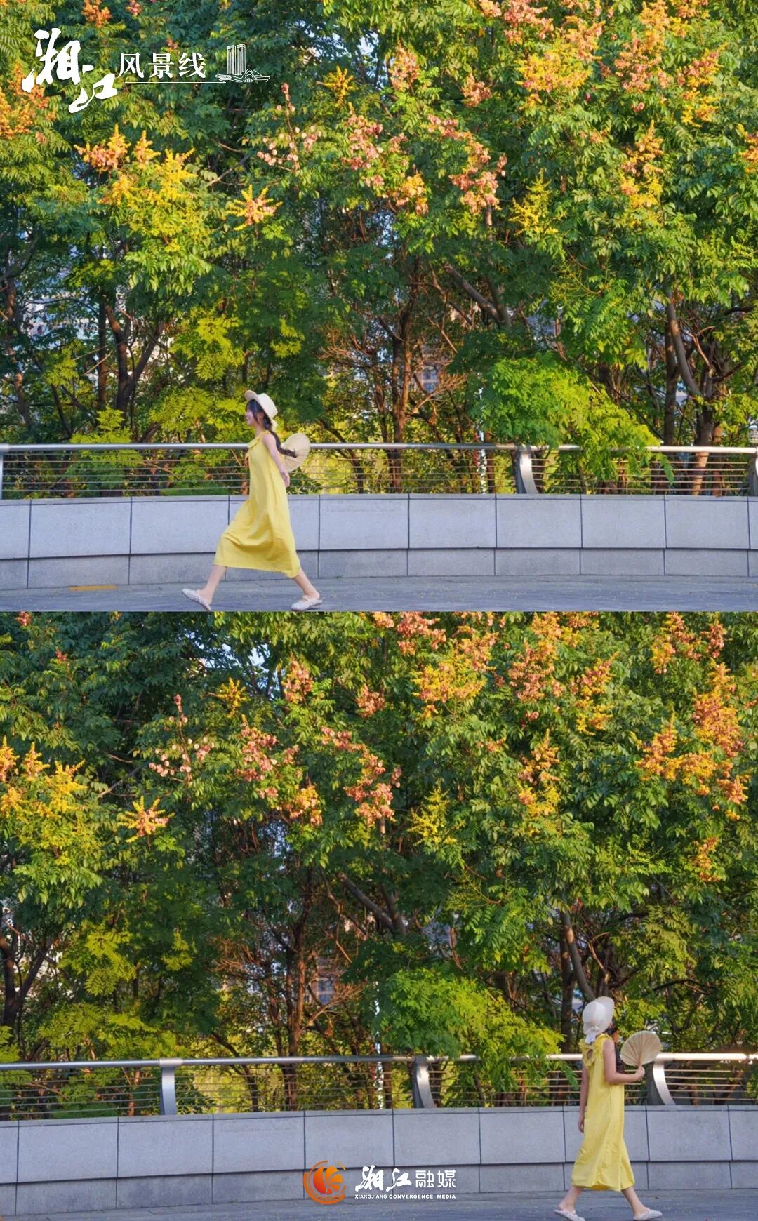 最近在长沙逛街,真的会被它“包围”!金黄的小花中点缀着粉红“灯笼”,风一吹就像下“黄金雨”,落在人行道上、车顶上,成了长沙初秋的 “氛围担当”。