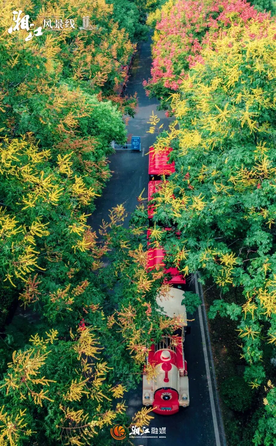 橘子洲的栾树大道上,五颜六色的小火车穿梭而过,一场橘洲秋日盛事正在上演。