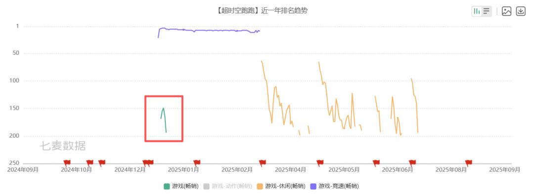 《超时空跑跑》表现更差,仅上线第一周短暂进入畅销榜,随后便掉出。