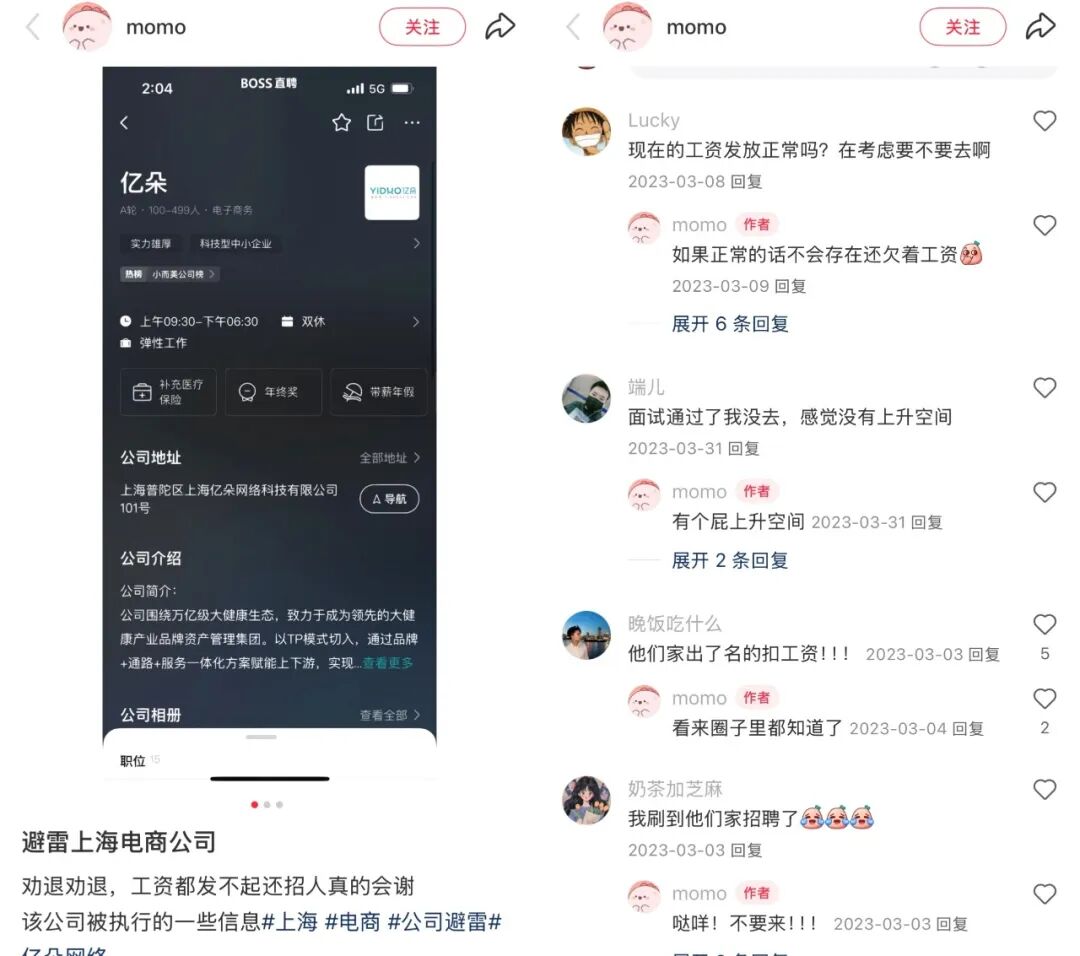 然而,高速扩张也埋下隐患。2023年4月,有小红书用户发“避雷亿朵电商”帖子,称“工资都发不起还招人”,自己也被亿朵电商拖欠工资。