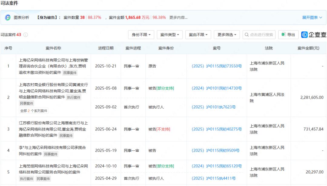 企查查显示,2022年起,亿朵电商陷入多起司法案件纠纷,涉案金额超1800万元。