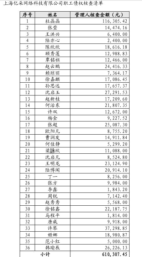 全国企业破产重整案件信息网披露的职工债权核查清单证实,亿朵电商拖欠员工薪资。
