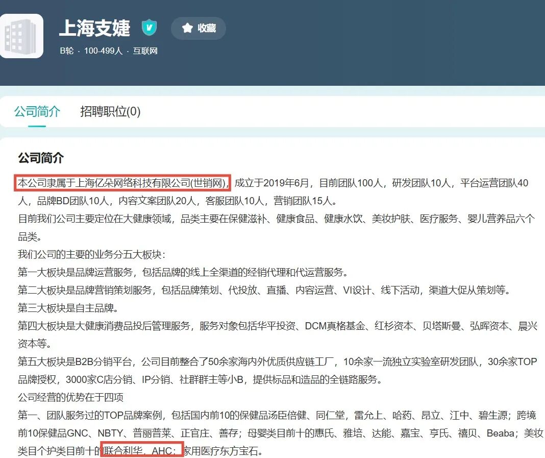 其旗下子公司上海支婕在招聘平台披露信息显示,亿朵电商合作的美妆护肤类客户有联合利华、AHC等国际知名品牌。