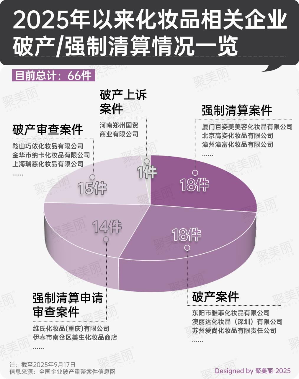 截至今年9月17日,全国已有66件化妆品企业的破产/强制清算案件公示。多数企业因业绩下滑、合同纠纷、资金链断裂等问题被迫终止运营。