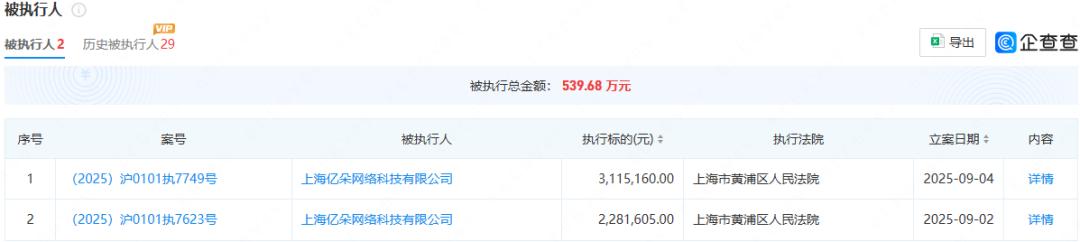 此外,亿朵电商29次被列为被执行人,被执行总金额197.25万元;今年9月,新增两起被执行案件,金额合计539.68万元。