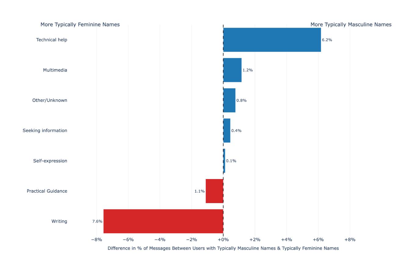 论文指出,ChatGPT推出初期,用户以男性为主(约占八成),但到2025年中期,女性用户(52%)占比已超过男性,且使用需求有明显差异。