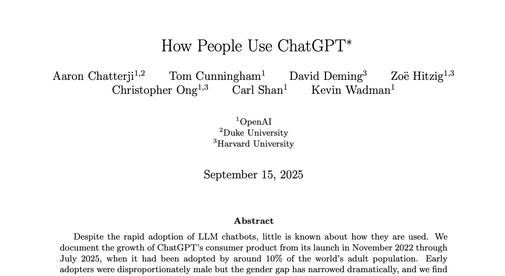 最近,一份由OpenAI与哈佛大学、杜克大学联合完成的研究报告《How People Use ChatGPT》问世。别看标题平平无奇,这或许是迄今最全面的一份「AI使用报告」。研究者没有依靠问卷和臆测,而是直接抽样超百万条真实对话,将ChatGPT用户的日常使用习惯剖析得清清楚楚。