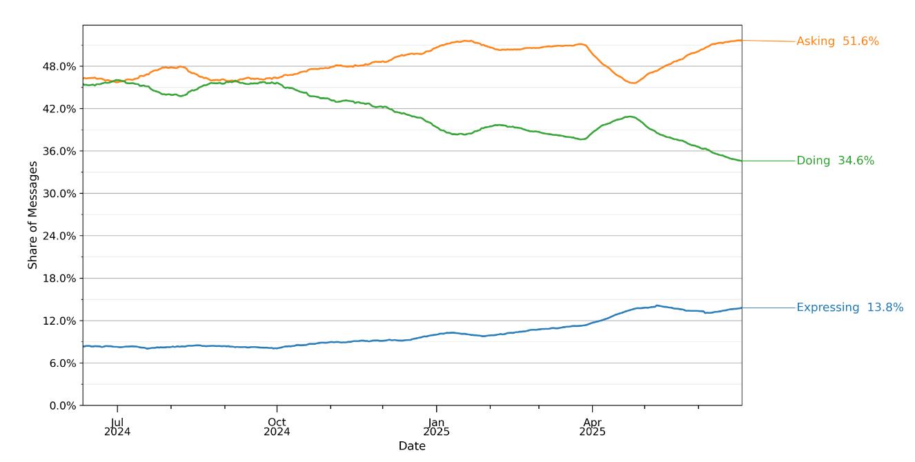 论文将用户动机分为三类:Asking(问)、Doing(做)、Expressing(表达)。总体上,「问」的占比最高(51.6%),「做」次之(超过三成),表达最少(仅一成)。但在工作相关场景中,情况反转:「做」跃升为56%,写作又是最主要的「做」。