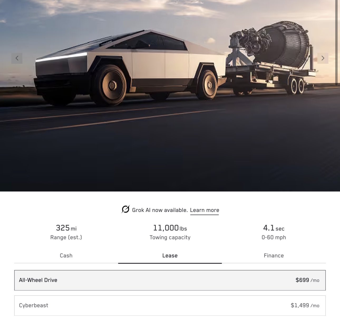 根据官方信息,特斯拉Cybertruck后轮驱动版(入门版)被移除,意味着该版本正式下架,而这一版本推出还不到半年。